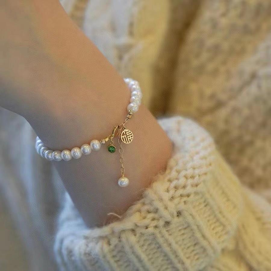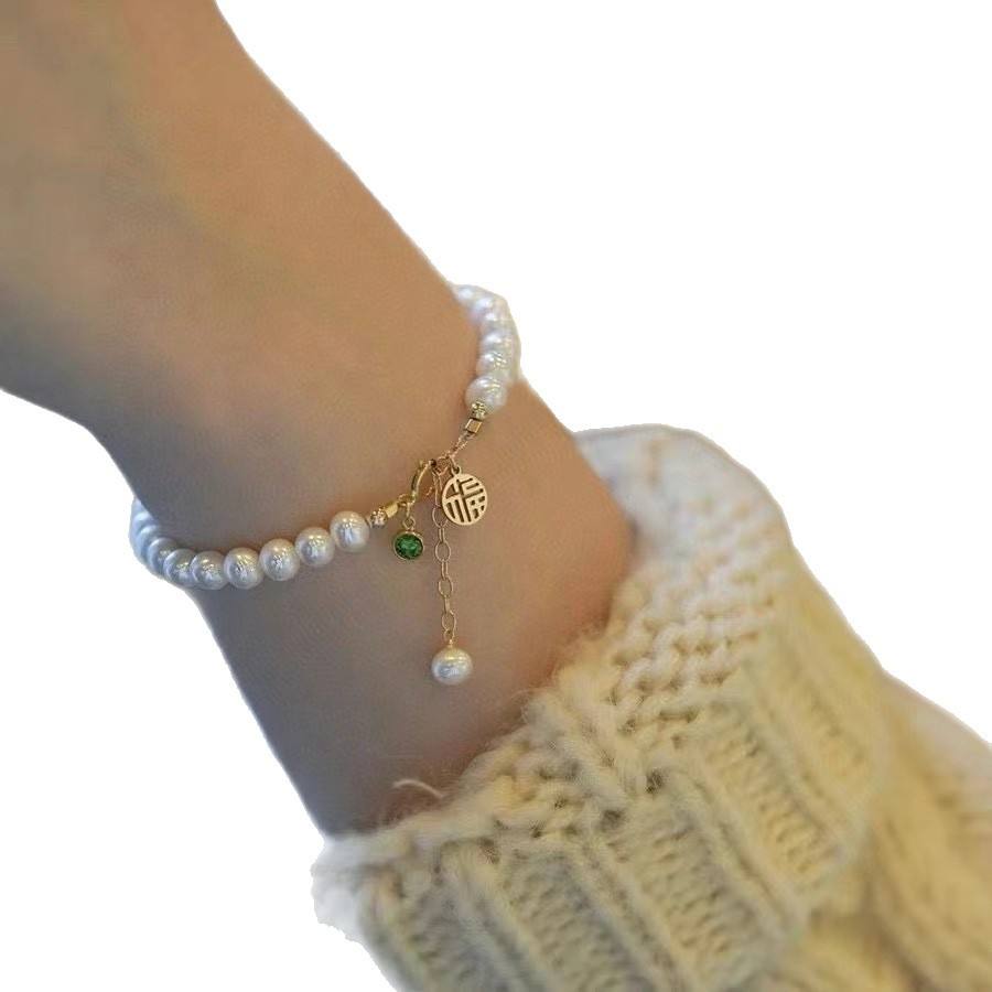 Fu Pai Simple Elegant Green Stone Pearl Bracelet 5-6mm Freshwater Pearl Adjustable Tail for Daily Wear Fashion Charm Bracelets