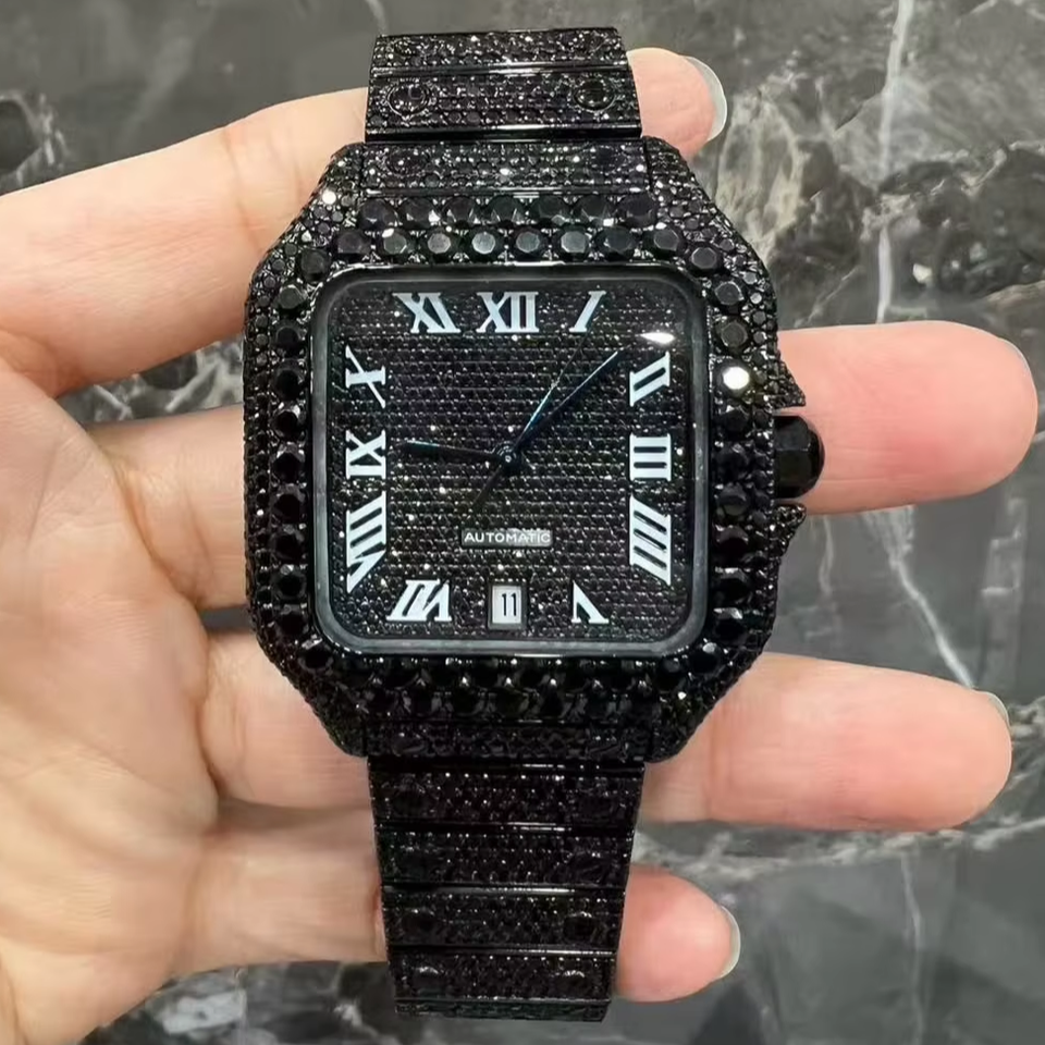 Full Black Roman VVS Diamonds Luxurious Glass Stainless Steel Fully Iced Moissanite Movement Automatic 41MM Watch