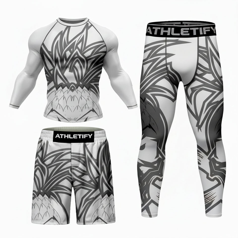 Sublimated Compression Breathable Quick Dry Sportswear Set Unisex Rash guard Training Shorts and Tights for MMA Fitness Running