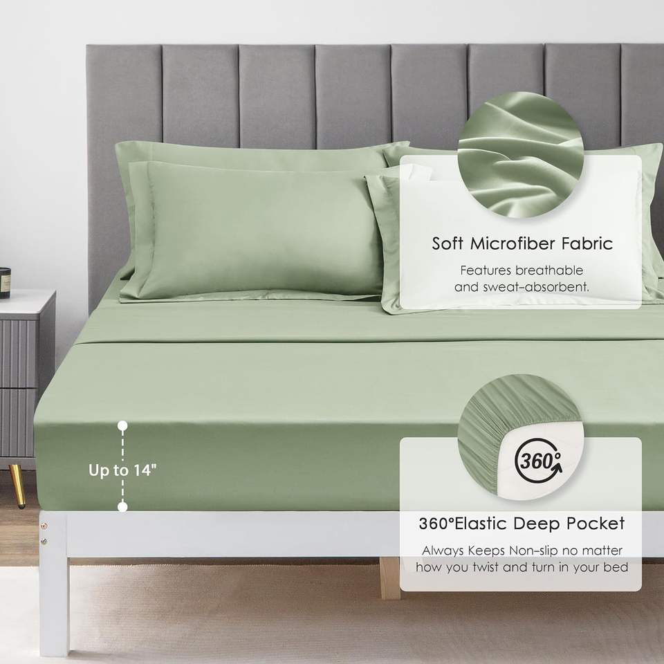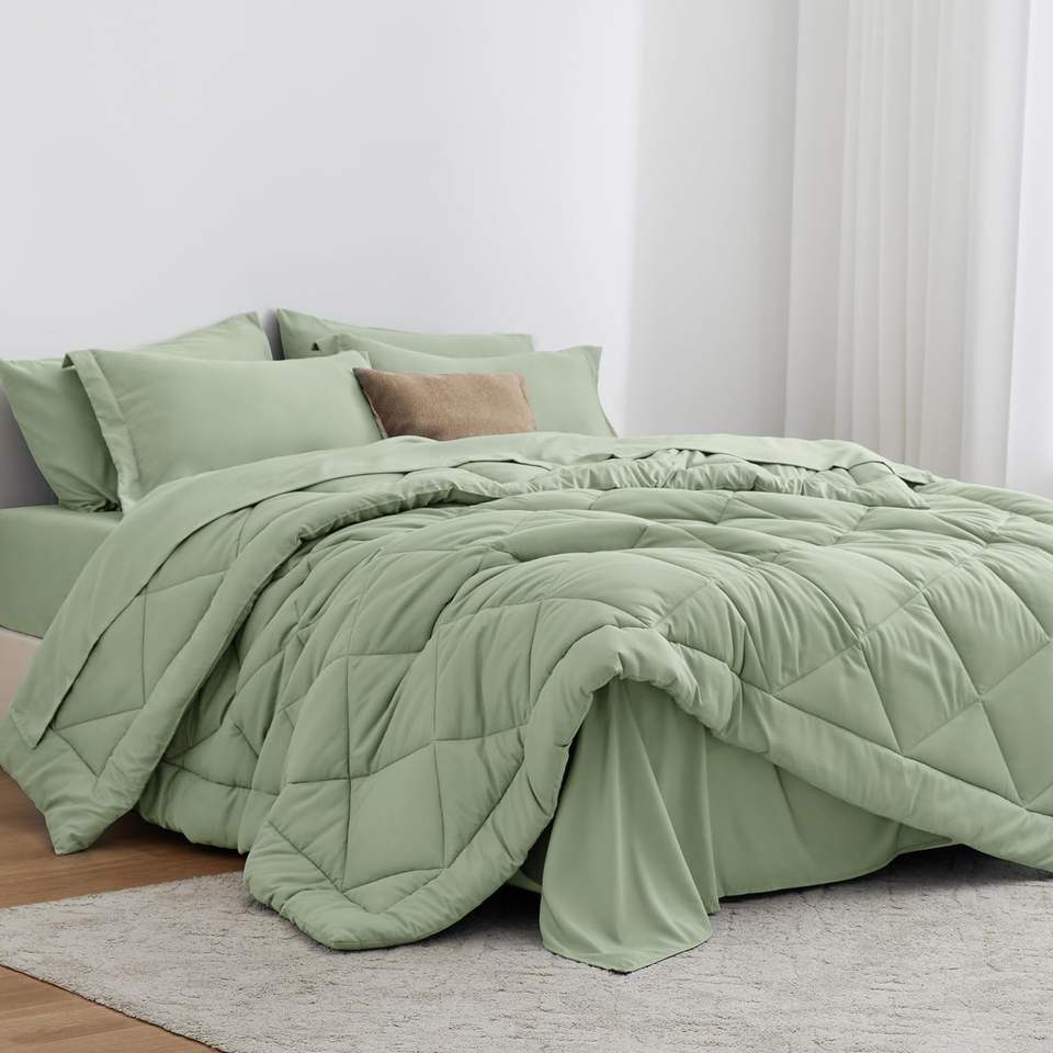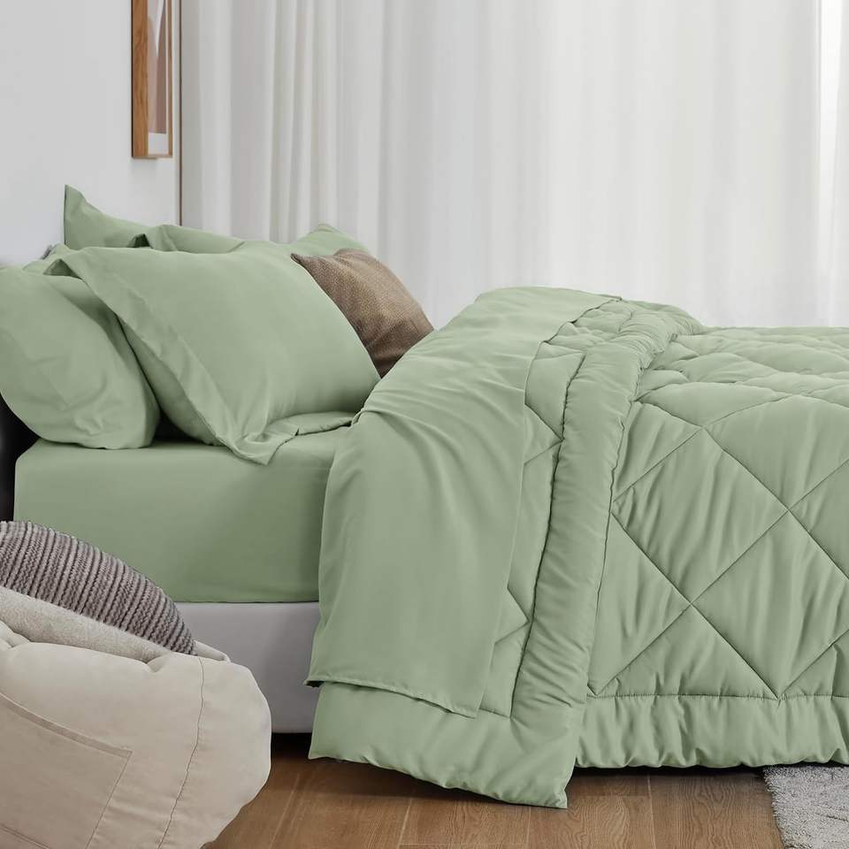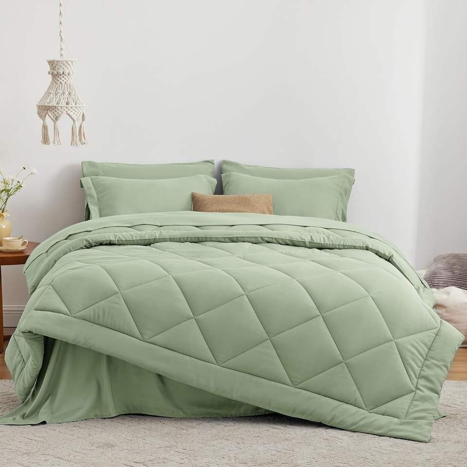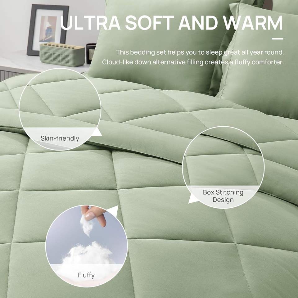 Full Comforter Set Sage, Full Bedding Sets with 1 Comforter, 1 Flat Sheet, 1 Fitted Sheet, 2 Pillowcase and 2 Pillow Sham