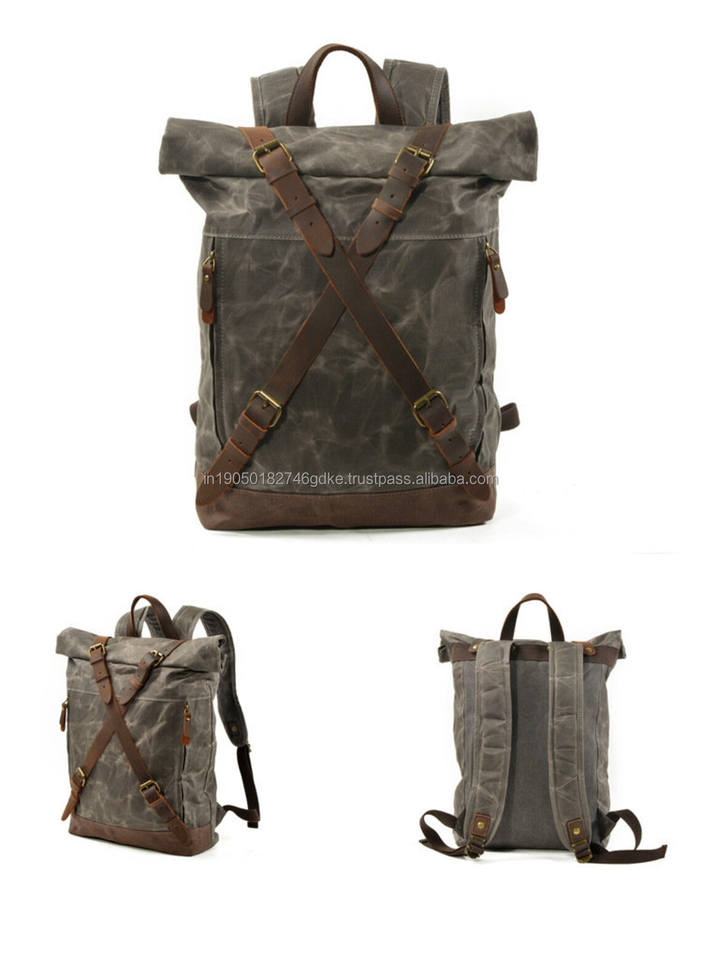 Full Grain Leather Waxed Canvas Rucksack Custom Embossed Logo Zipper Vintage Big Capacity Camping Trekking Backpack Carrying