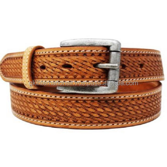Full Grain Tan Finish Western Leather Tooling Belt for Men and Women Hand Carved Basket Weave Pattern Tooled Leather Cowboy Belt
