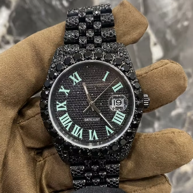 Full Iced Out Black Diamond Watch Round Luxury Date Display Wristwatch with Luminous Roman Numerals Hip Hop Bling Jewelry