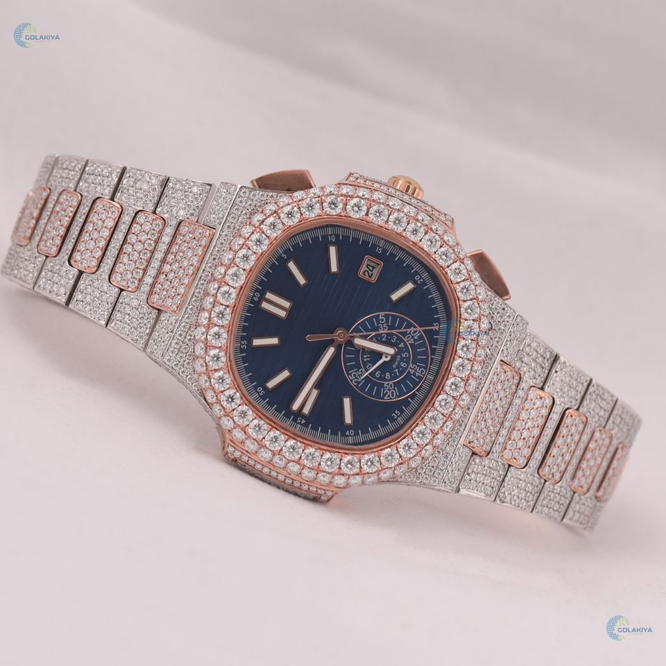 Full Iced Out Moissanite Wrist Watch Elegant Blue Dial Wrist Watch Date Display Luxury Watch