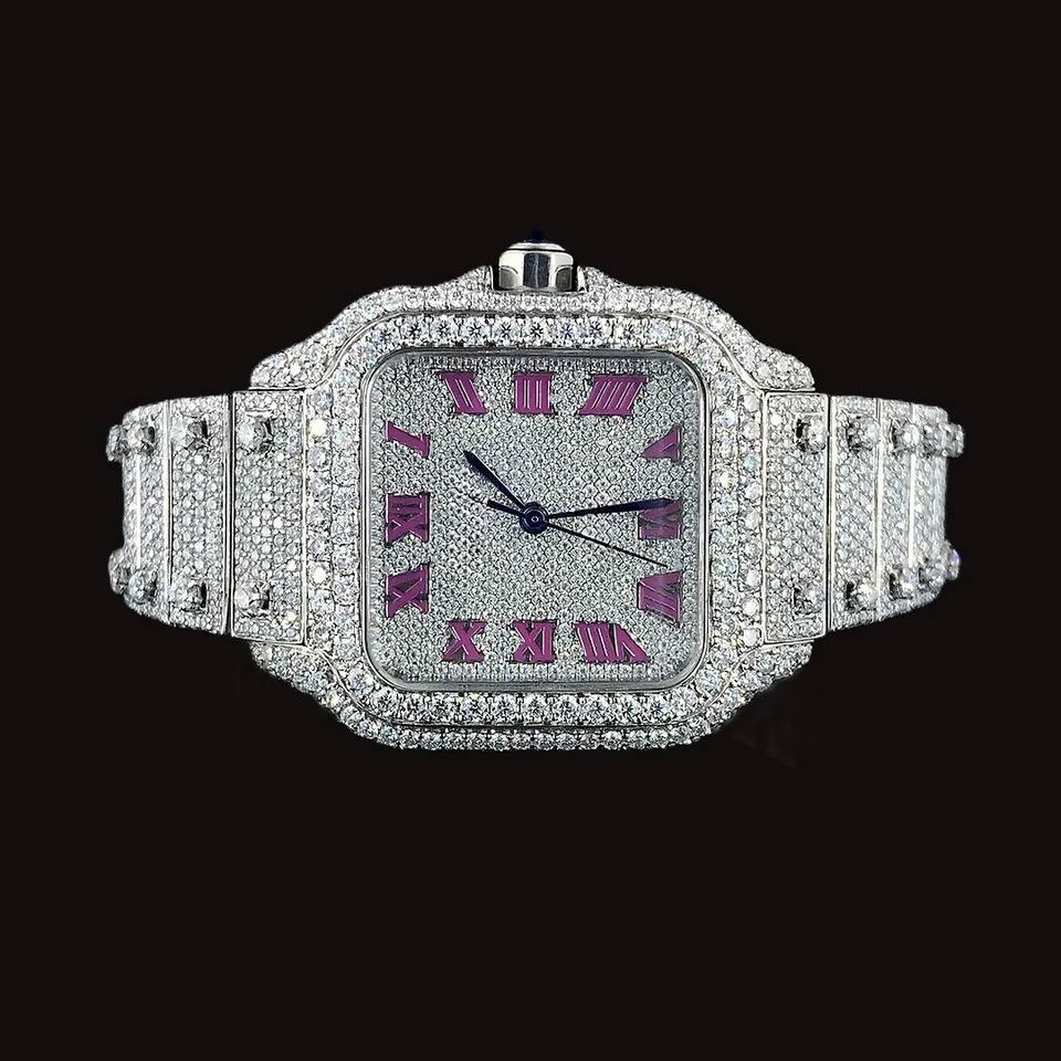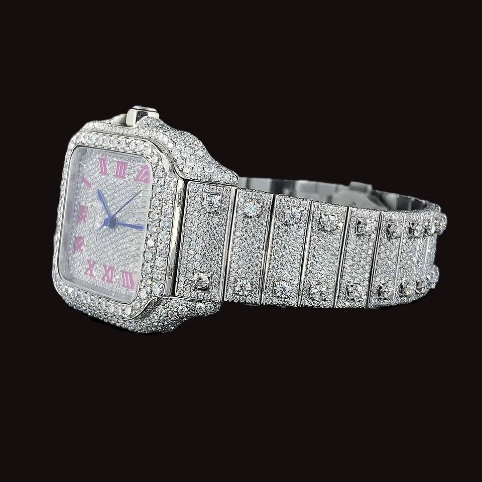 Full Iced Out Round Cut Moissanite Diamond Luxury Watch With Classic Pink Roman Numerals Features Diamond Watch Gift for Girls