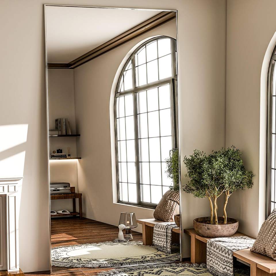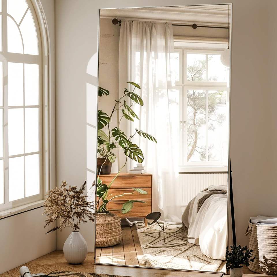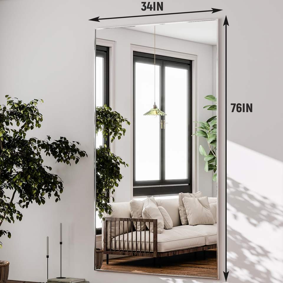 Full Length Mirror Extra Large Hanging or Tilted Rectangular Mirror Aluminum Thin Frame Bedroom Floor Dressing, Silver