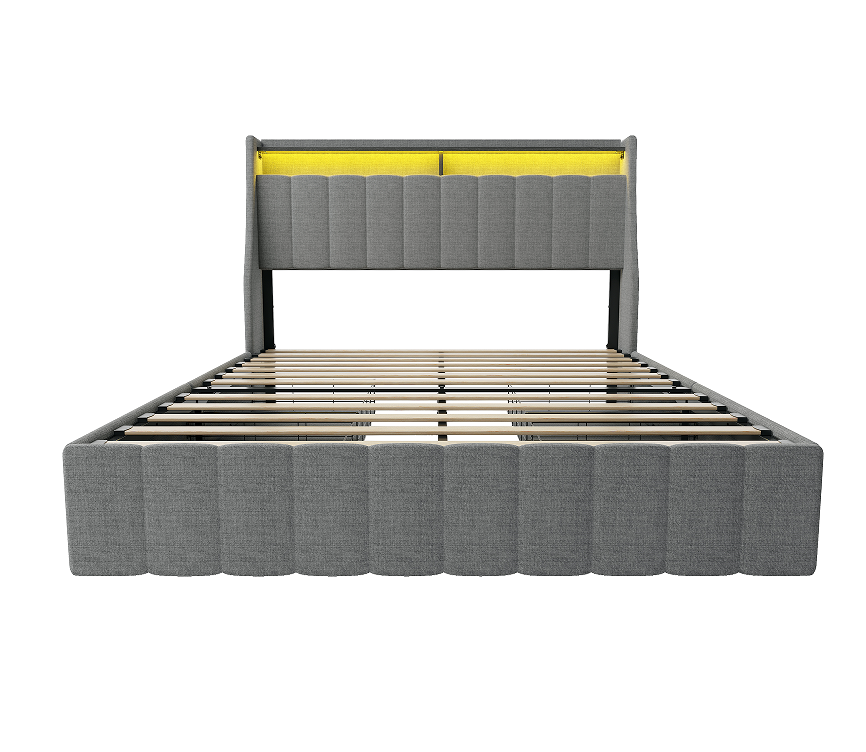 Full Size Bed Frame with LED, 4 Under-bed Portable Storage Drawers, Wings Headboard Design, Light Grey