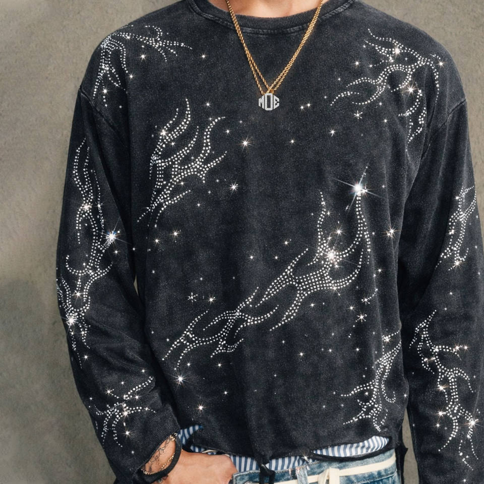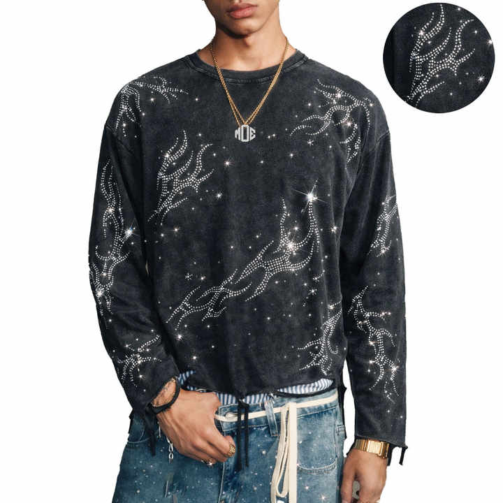 Full Sleeve Rhinestone Design Men's Tshirt Top Quality Acid Wash Oversized Men's shirts Premium Cotton Custom Logo Street Style