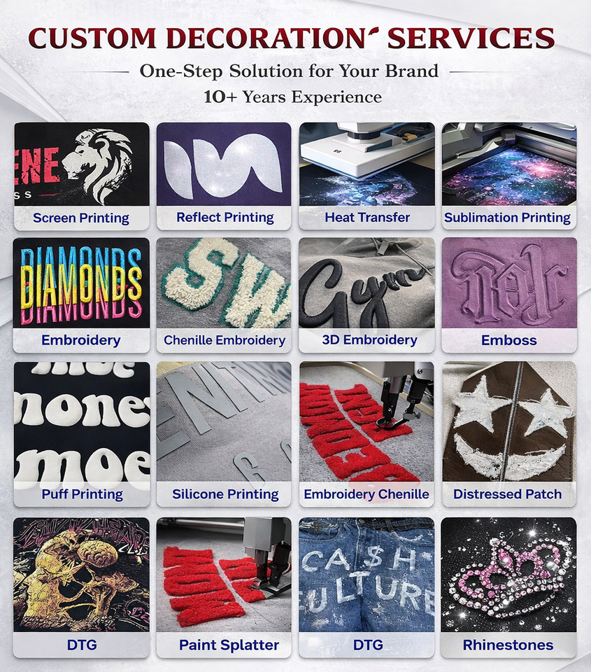Logo position:Front, back, Left Sleeve, Right Sleeve, lower hem, back neck