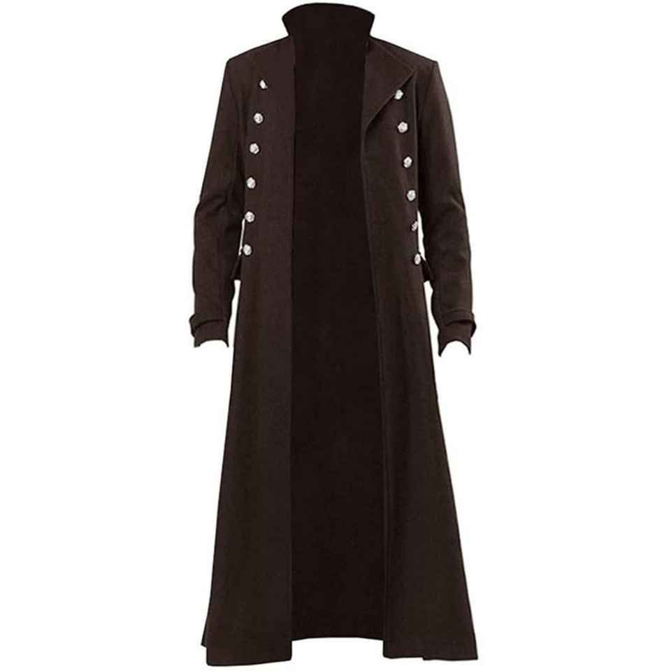 Full length gothic coat for men with slim fit cut metal buttons and stand collar for cosplay wedding and winter season