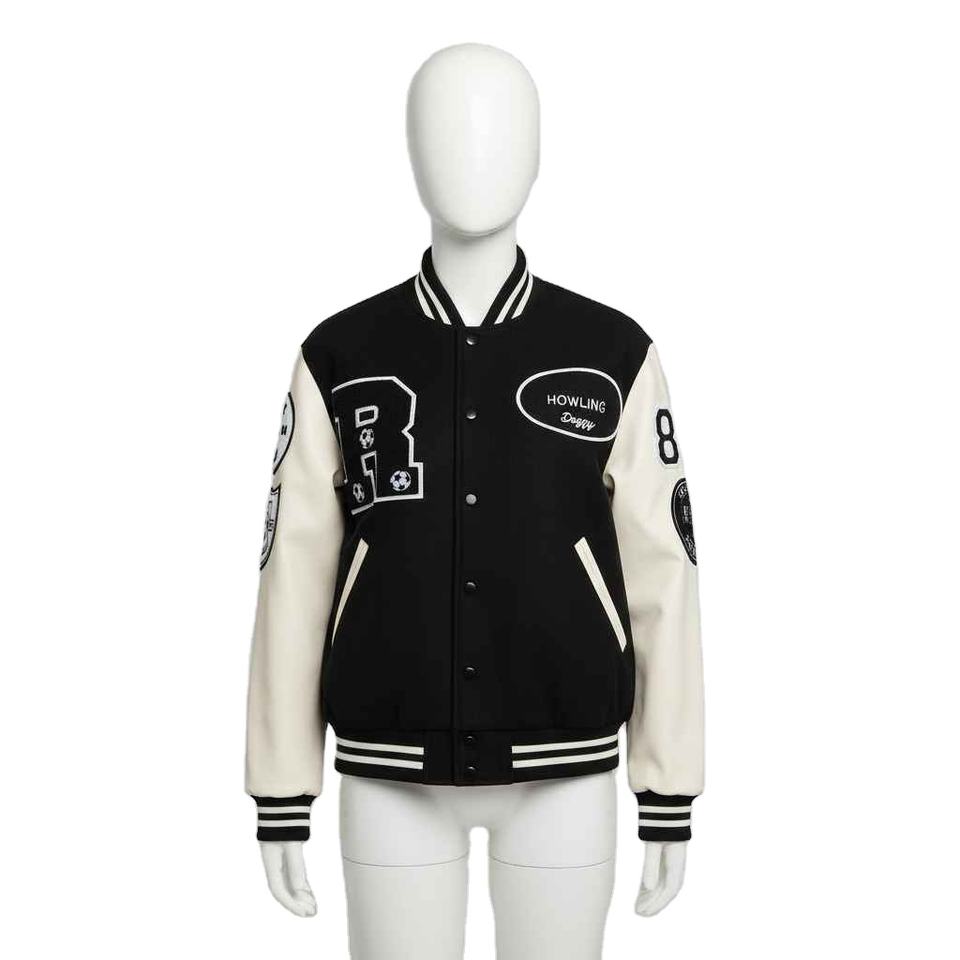 Fully Customised Fashion Forward Black & White Varsity Bomber Streetwear College Jacket with Custom Patches & Ribbed Trim