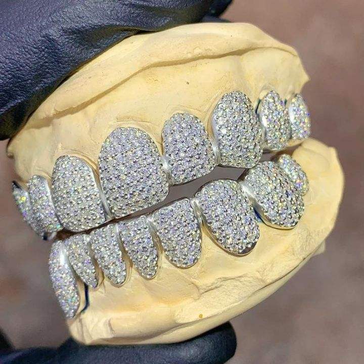 Fully Iced Out Enhanced VVS Clarity Moissanite Diamond Iced Out Teeth Grillz Hip Hop Jewelry in 925 Sterling Silver Custom Size