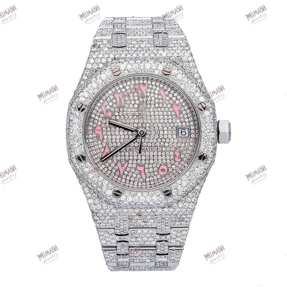 Fully Iced-Out Moissanite Diamond Watch with Pink Arabic Numerals and Automatic Movement Sparkle for Bold Style Statements