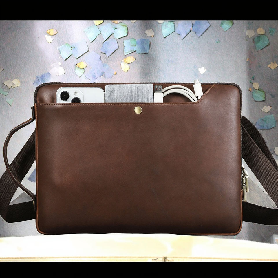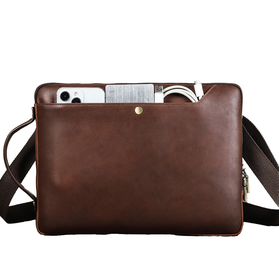 GA176 14.2 Inch Men's Crazy Horse Genuine Leather Laptop Bag Multi-Functional Crossbody Shoulder Handbag for MacBook Pro Padded