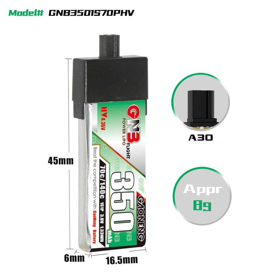 GAONENG GNB 1S 3.8V HV 350MAH 70C A30 Plastic Head RC LiPo Battery Mini Quad Micro Whoops PowerWhoop Quads Quadcopter Helicopter