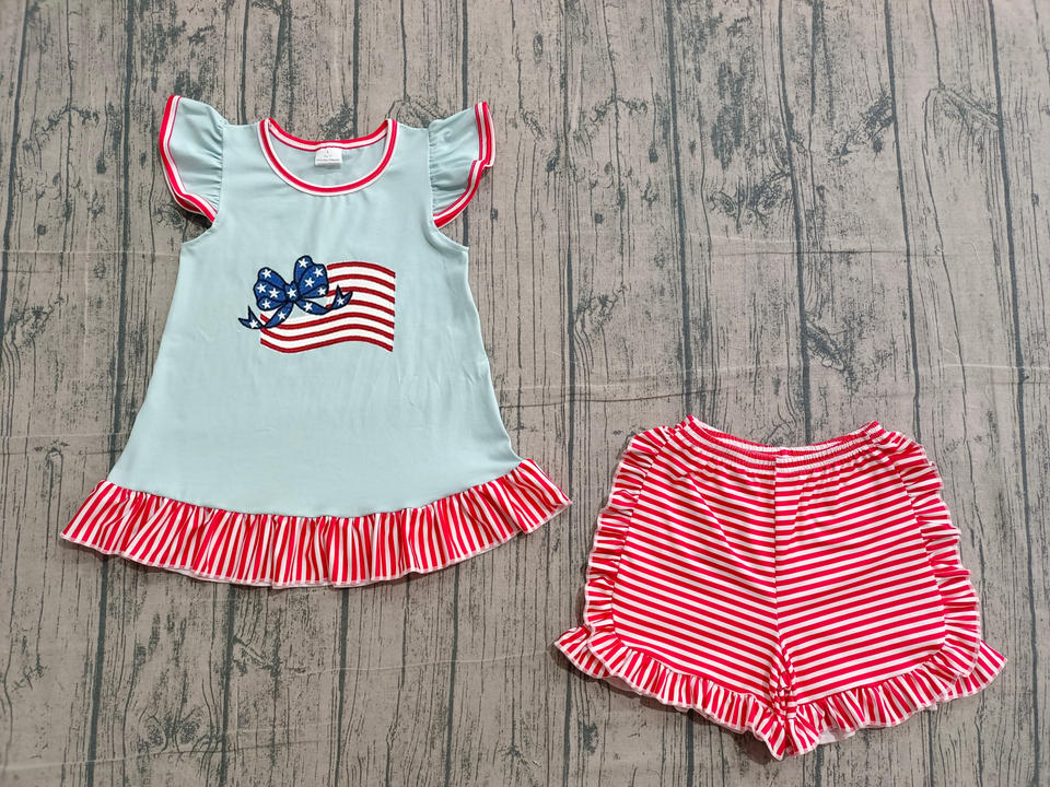 GBO0486 Custom No MOQ Casual Style Toddler Girl Clothing Set Blue stripe bows Print short Sleeve Bummies Kids Wholesale
