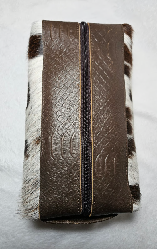 GENUINE HANDCRAFTED BLACK COLOUR GENUINE STYLISH AND DURABLE COSMETIC BAG BLACK AND WHITE PRINT COWHIDE TOOLING LEATHER BAG