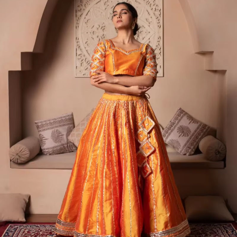Product Name:ORANGE TAFFETA SILK GOTA PATTI LEHENGA SET