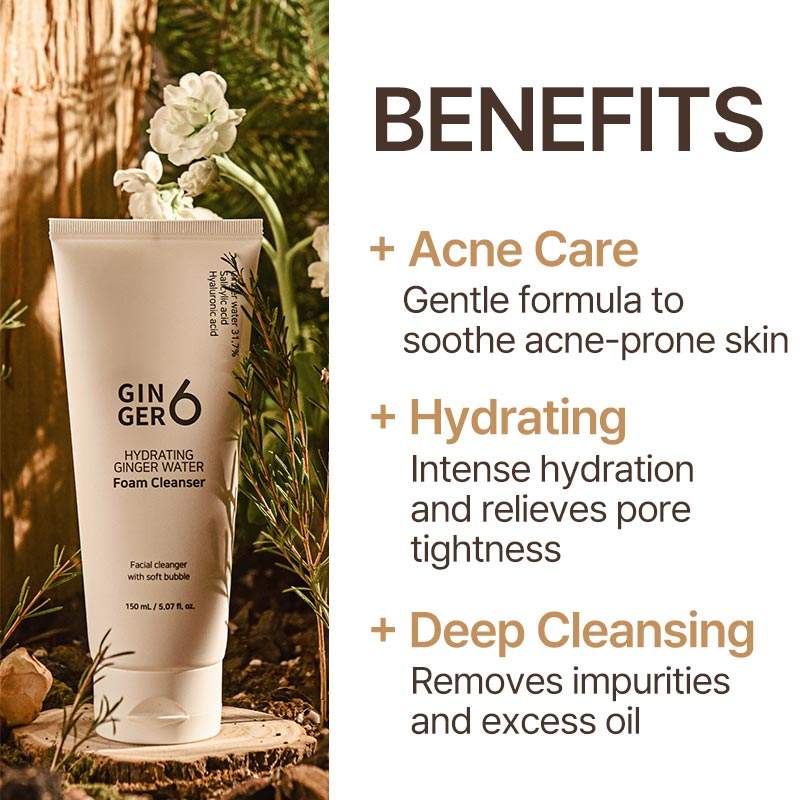 GINGER6 Vegan Hydrating Ginger Water Foam Cleanser for Acne & Oily Skin Hyaluronic Acid Alkaline Formula Glycerin Ingredient