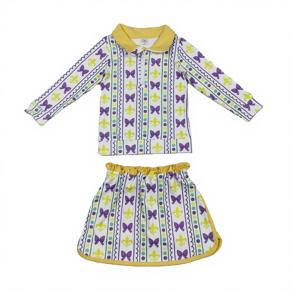 GLD1363 RTS active girl mardi gras bows pattern print outfits kids wholesale girl yoga child Athletic skirt set