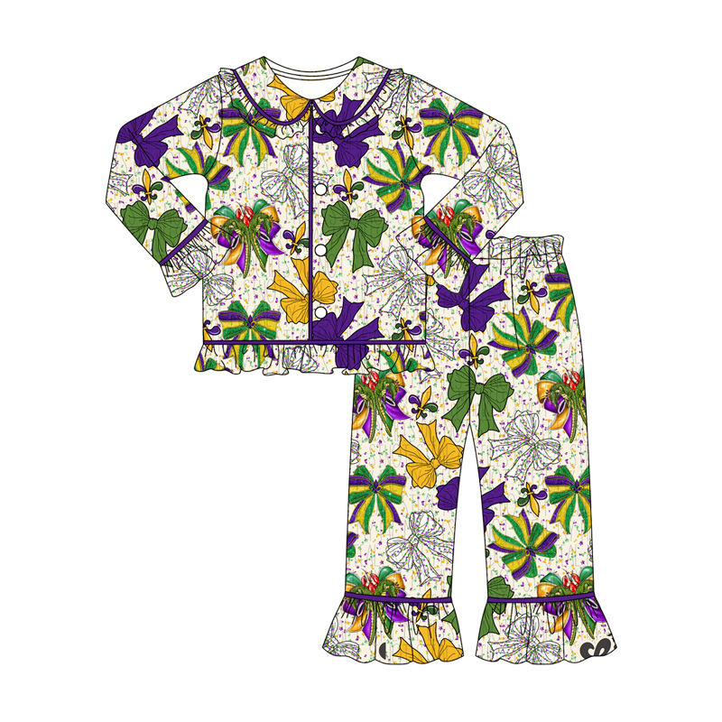 GLP2838 Wholesale Custom Little Girl Pink bows Long Sleeve Clothing Set Fall pajamas for Kids