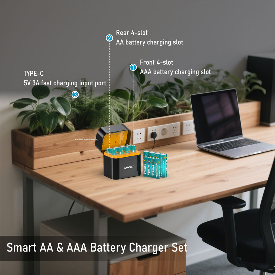 GMCELL 5V 3A Li-Ion Battery Portable Smart Charge 15W AA and AAA Rechargeable Battery Charger With 8Pcs 1.5V Battery