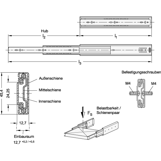 GN 1450 Modern Stainless Steel 2-Fold Telescopic Slides Soft Closing Full Extension for Kitchen Drawers & Furniture 45mm Width