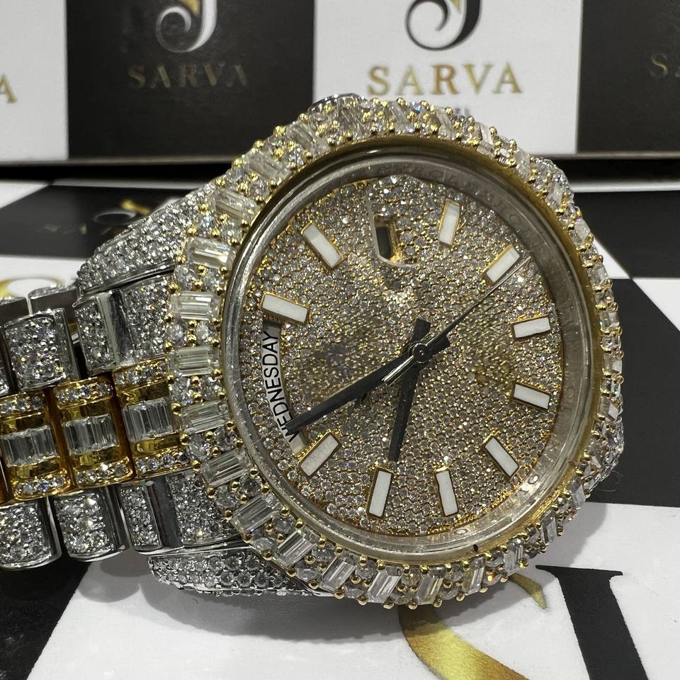 Luxury Men's Iced Quartz Watch with VVS Moissanite Baguette Cut Diamond Crystal Dial Window Hip Hop Style Crown & Band
