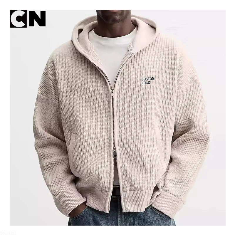 GRS Certification Sweater Manufacturer Custom Solid Color Drop Shoulder Zipper-Up Closure Knit Hoodie Sweaters Cardigan for Men