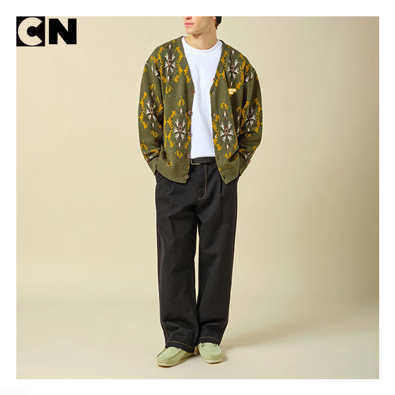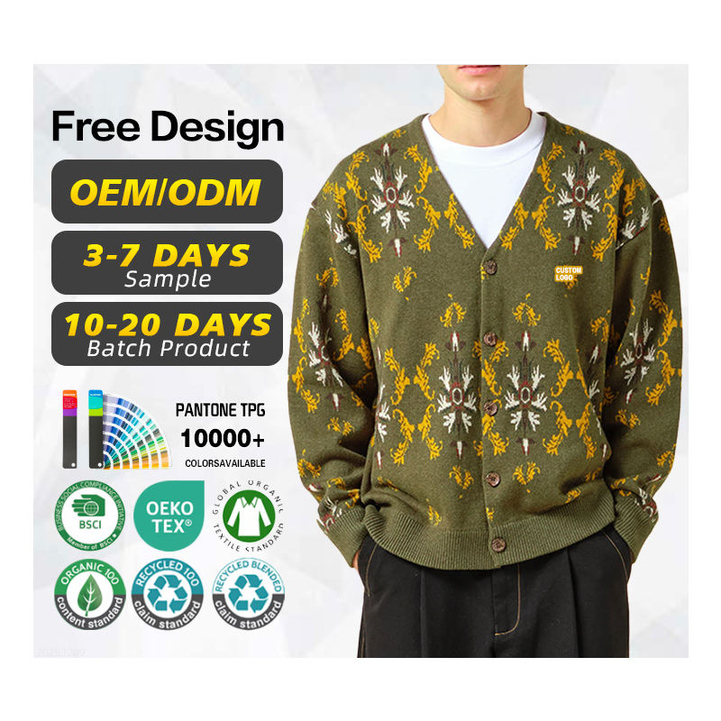 GRS Certified Winter Men's 100% Cotton Green Flower Jacquard Knitted Cardigan Sweater with Custom Logo and Single Button Closure