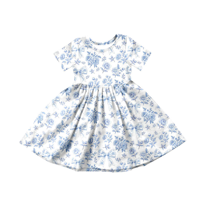 GSD3568 Custom Baby Girl Summer Pink bear Flowers Bows Print short Sleeve Knee-Length Breathable Dress Wholesale