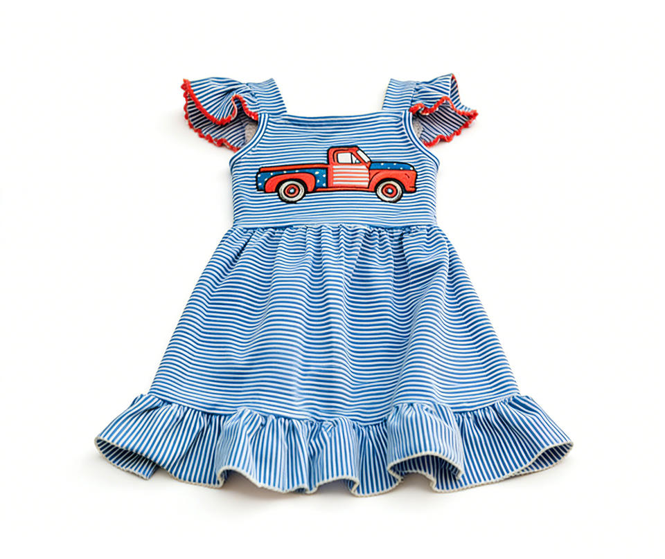 GSD3629 Custom Baby Girl Children Summer Blue stripe cars Print Sleeveless Knee-Length Cotton Spandex Dress Wholesale