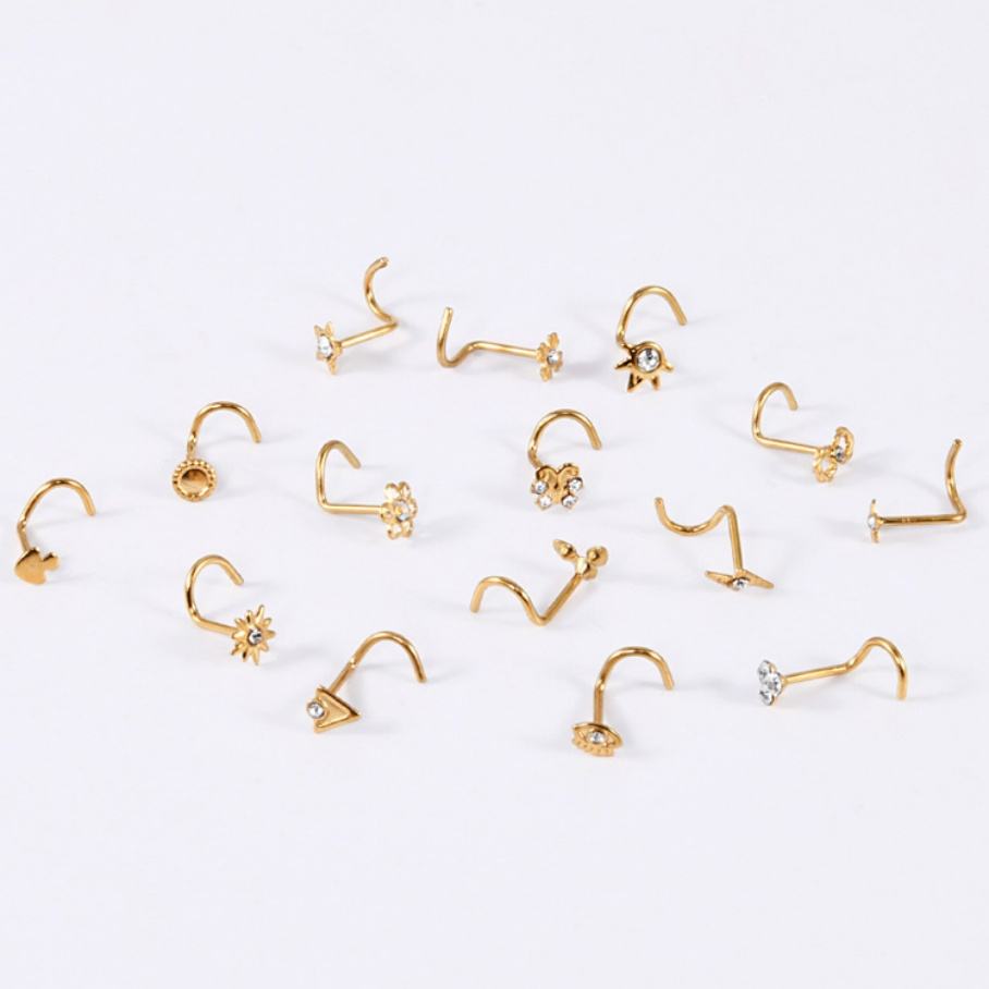 Gaby 18K Gold Plated Stainless Steel S-Screws Flower Star Nose Stud and Bone Ring Piercing 20G Trendy Daily Wear Body Jewelry