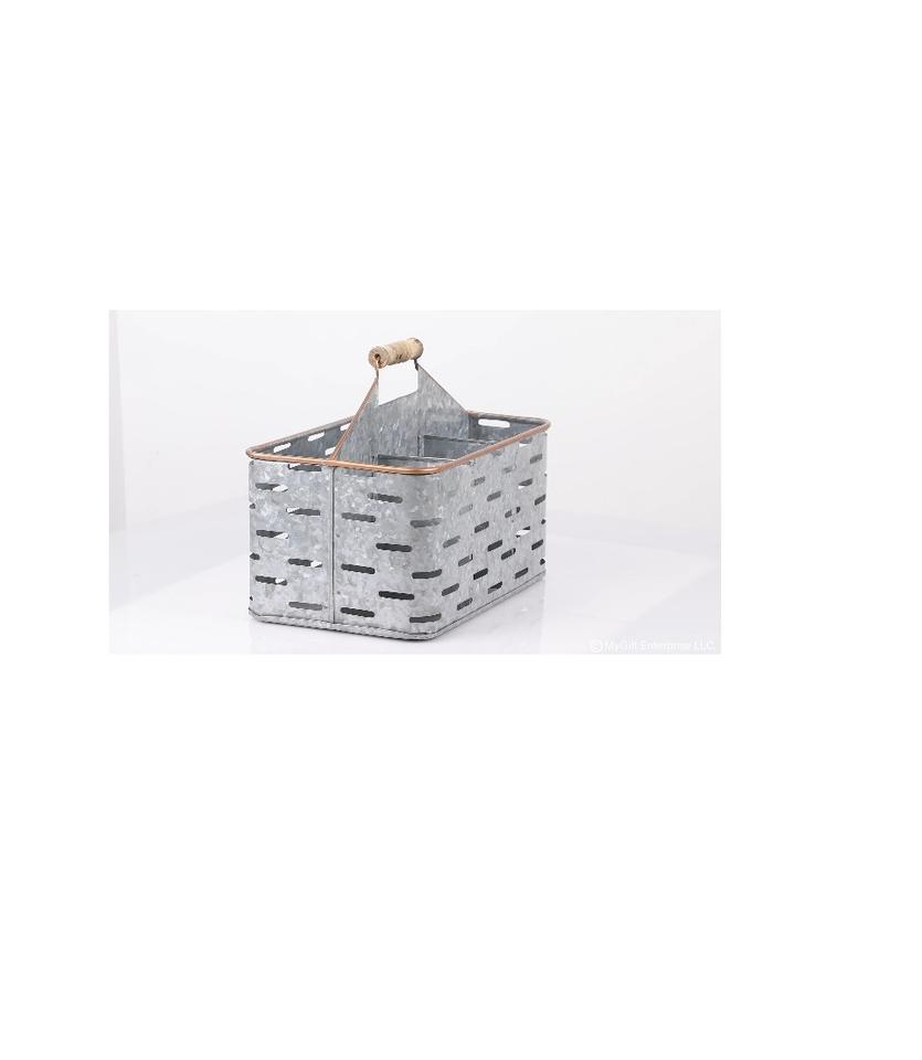 Galvanized utensil caddy with reinforced handles and four compartments for holding silverware and party supplies