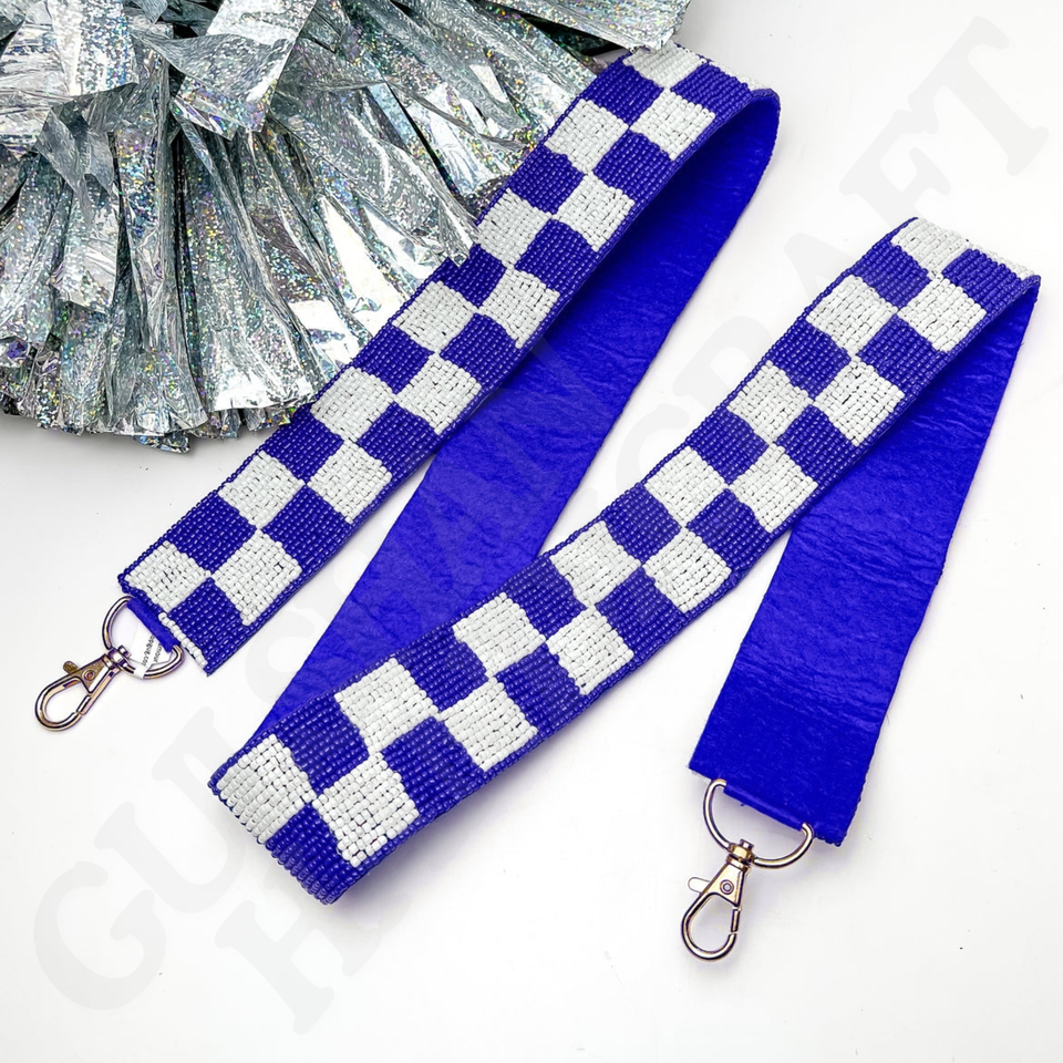 Handmade Embroidered Blue White Checkered Cotton Purse Strap Adjustable Customizable Seed Bead Bag Game Day Tailgates Concerts