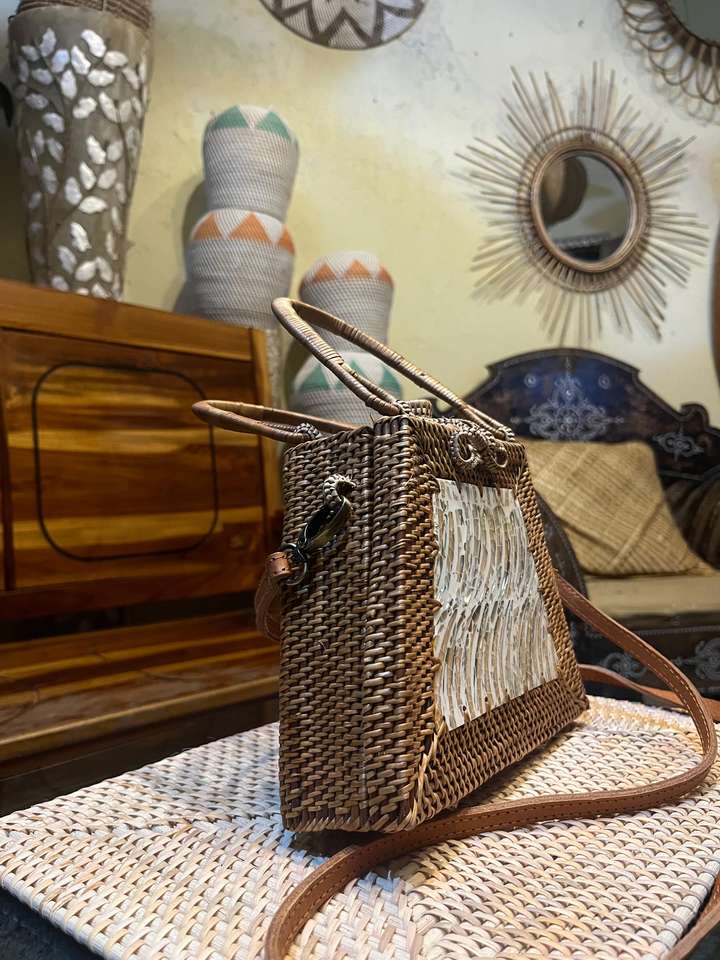 Gandek Sasak Authentic Lombok Handwoven Ketak & Rattan Traditional Shell Motif Wicker Crafts Leather Strap Triangle Shell Bag