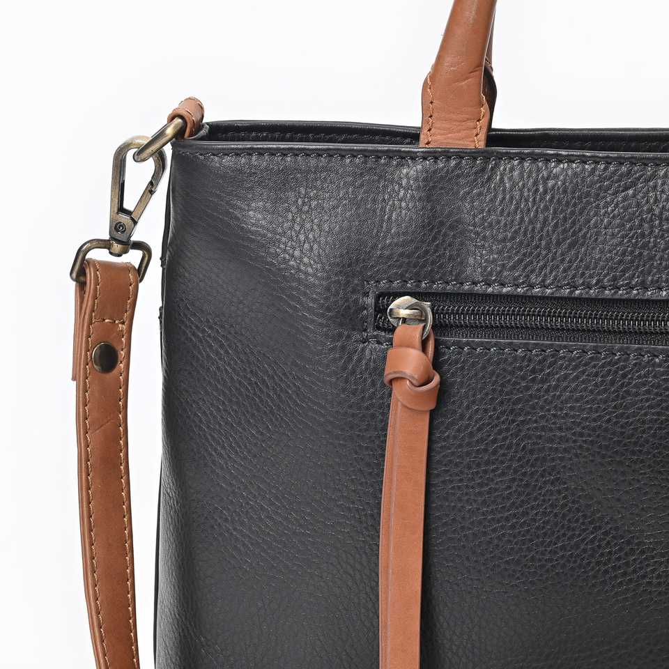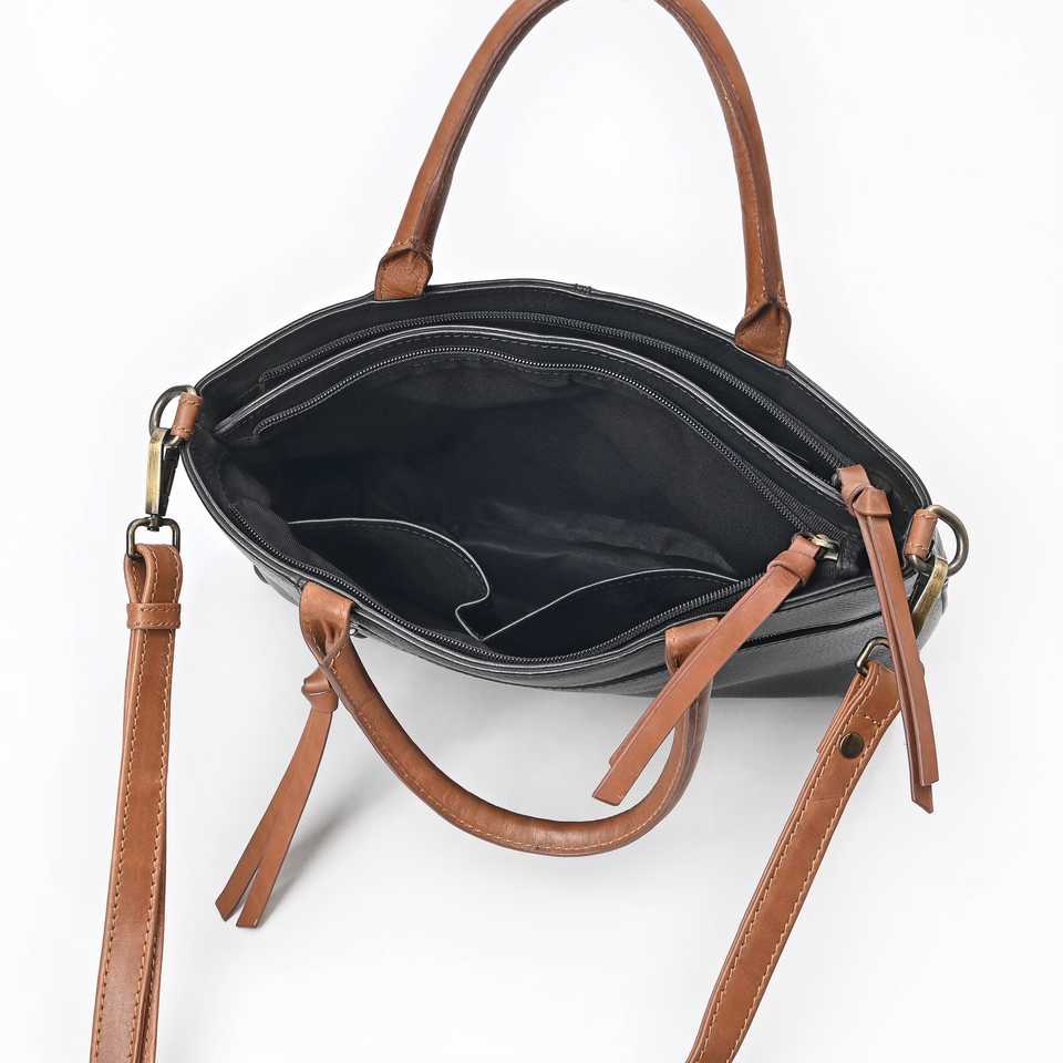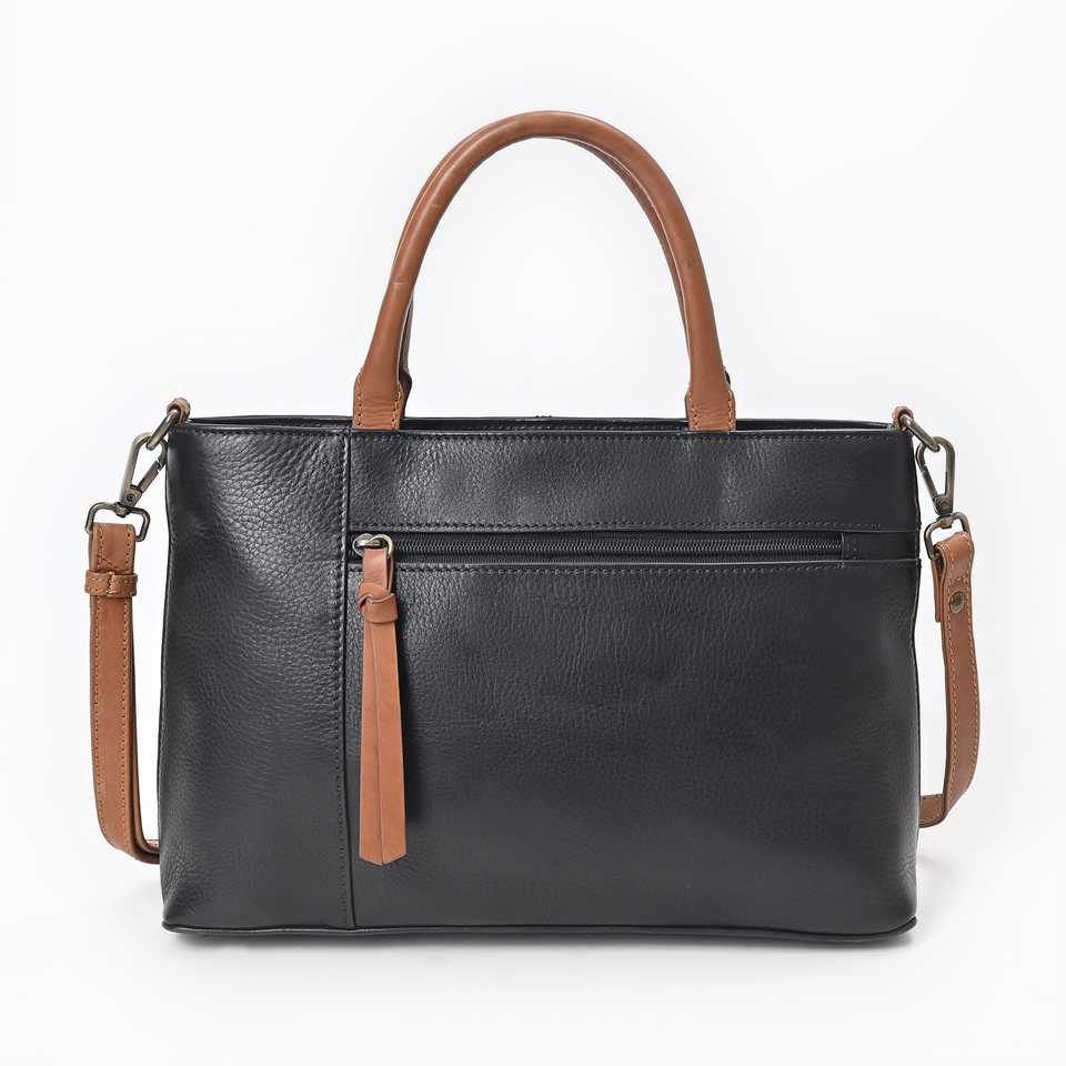 GangesGrain Luxury Casual Tote Handbag Black Leather Structured Satchel with Tan Accents Two Handles Open Closure for Beach Use