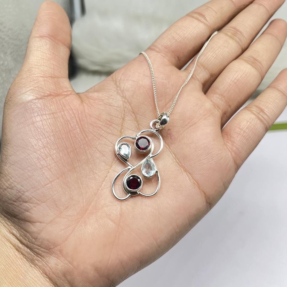 Garnet Aquamarine Silver Necklace Pendant, Solid 925 Garnet Aquamarine Gemstone Pendant Necklace for Women, Birthstone Necklace