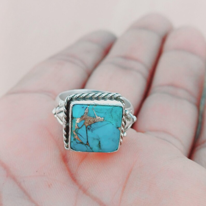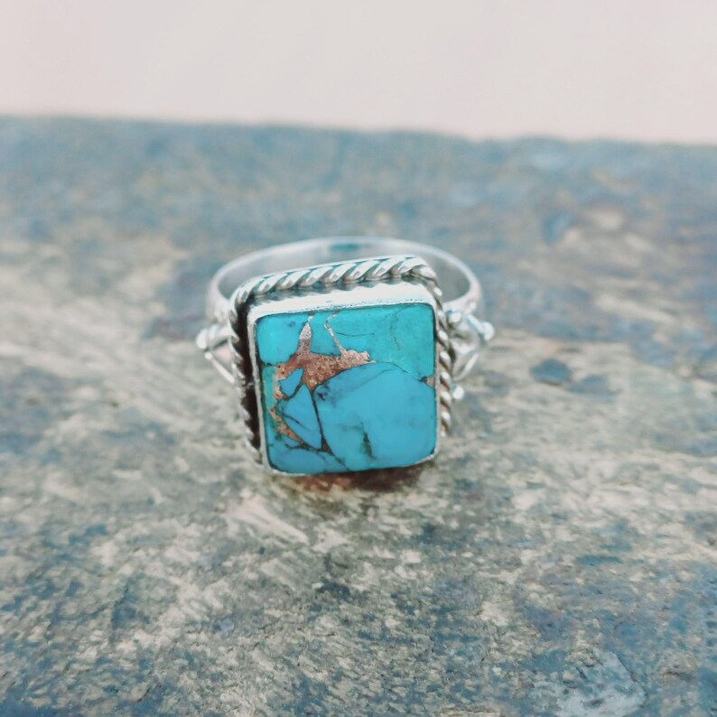 Genuine Blue Turquoise Ring 925 Sterling Silver Handmade Jewelry Cushion Shape Stone Ring For Wedding or Gift Factory Price
