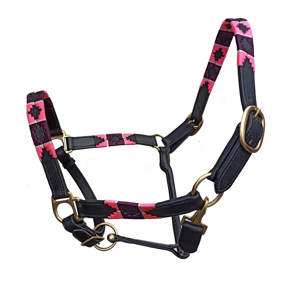 Genuine Brown Leather Horse Polo Halter With Pink + Purple Thread Braided Design Manufacturers Suppliers