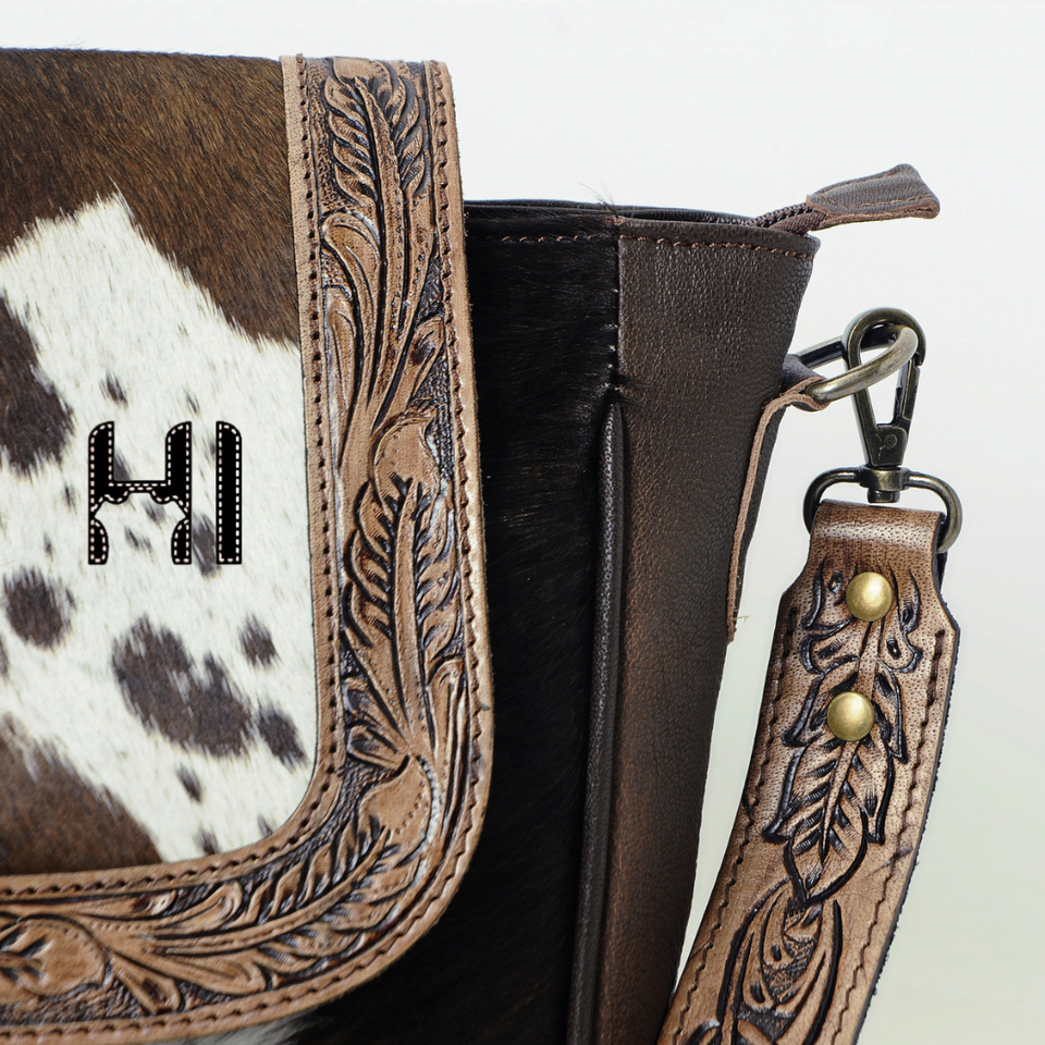 Description:Palmatisect leaf pattern carving on flap with cowhide, magnet on flap