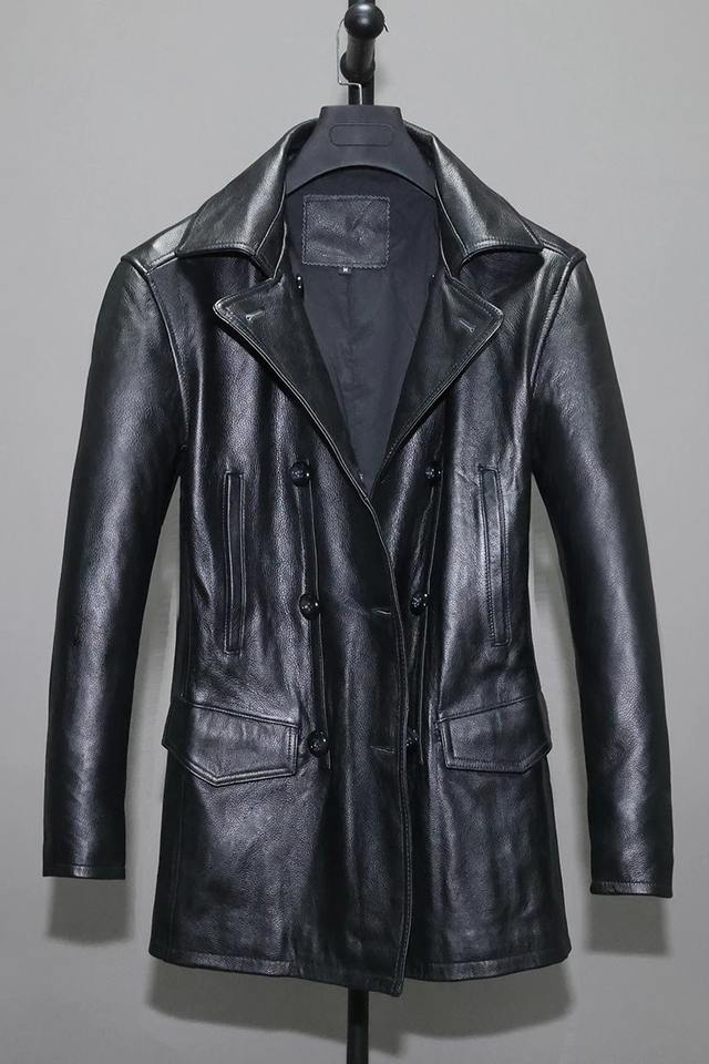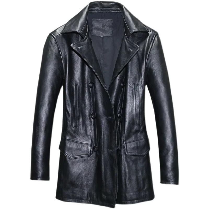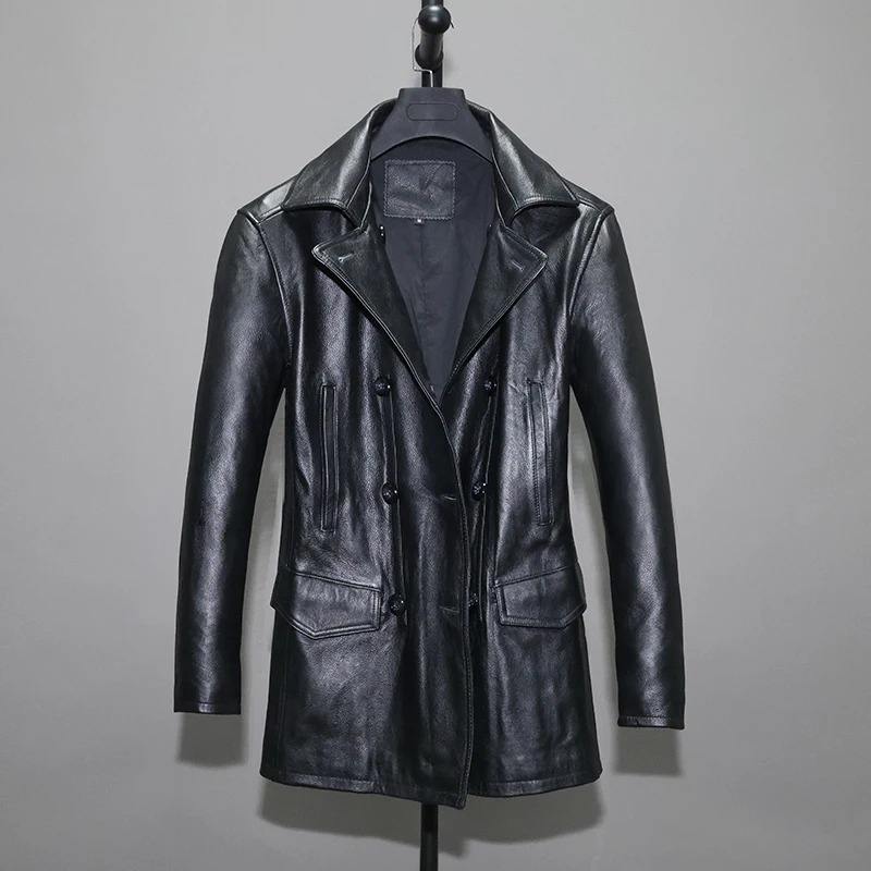 Genuine Leather Jackets Men Pure Cowhide Trench Coat Male Medium Lapel Double Breasted Korean Slim Natural Men's Leather Jacket