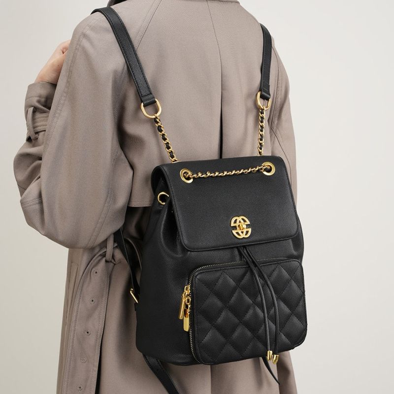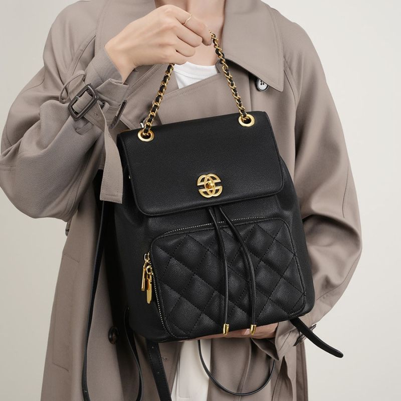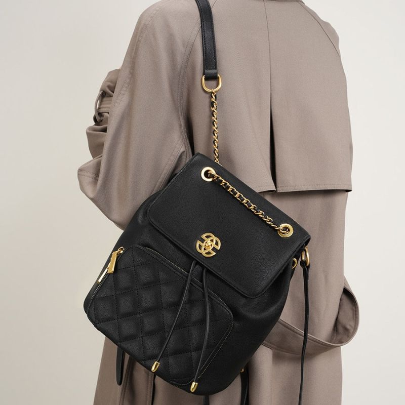Genuine Leather Stylish Backpacks for Girls High Quality Black Leather Quilted Backpacks Twist Lock Chain Backpack Handbags