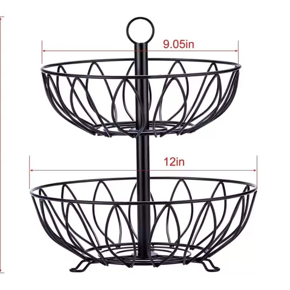 Geometric 2-Tier Fruit Basket Wood Base Metal Frame Handcrafted for Kitchen Countertop Storage Food Spices Bags Cleaning