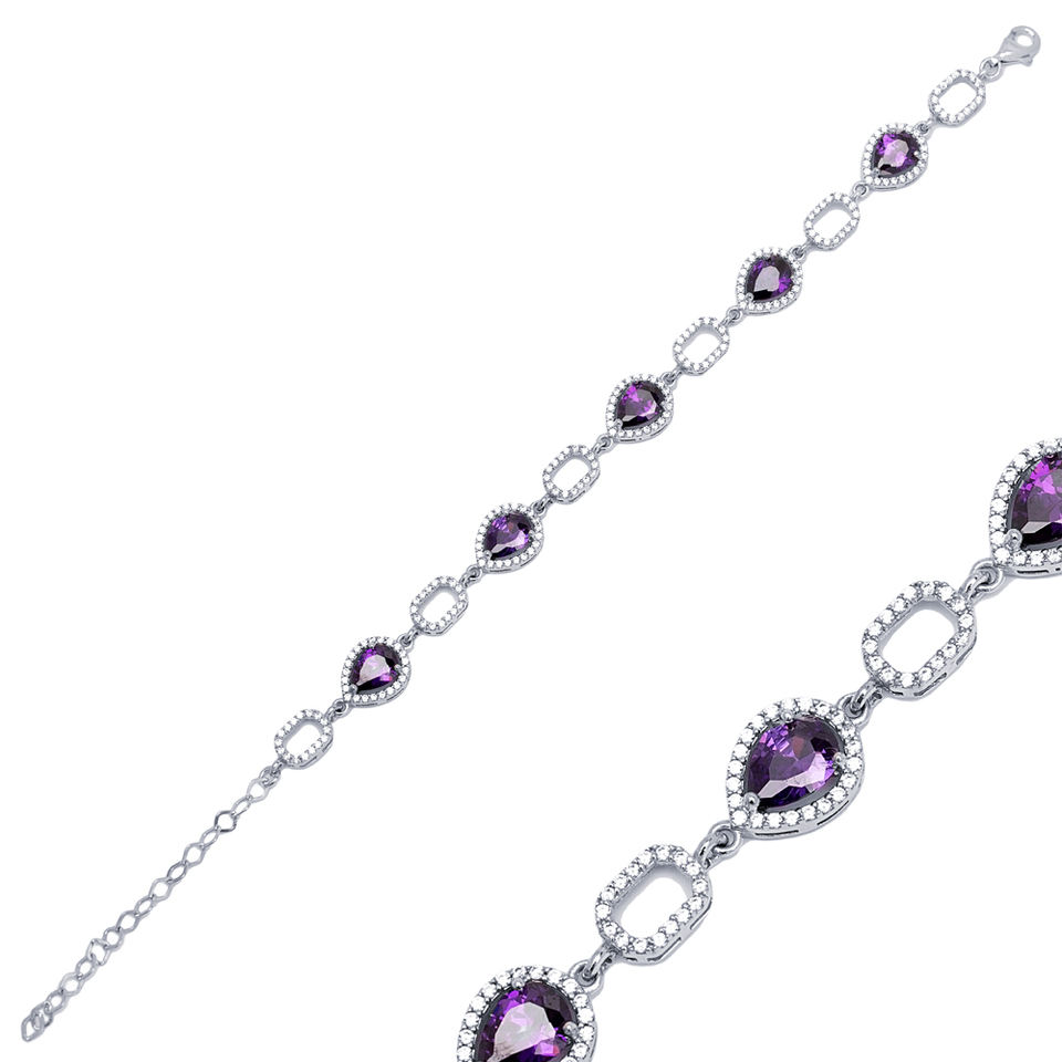 Geometric Drop Pear Design Amethyst Stone Charm Bracelet Handmade Turkish 925 Sterling Silver Jewelry