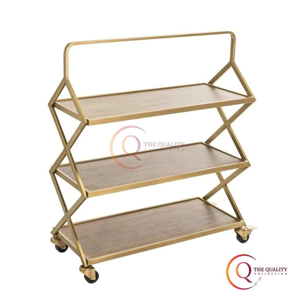 Geometric Elegant Three Tier Rolling Cart with Chic Zigzag Design and Natural Wooden Shelves and Gold Accents Metal Frame.