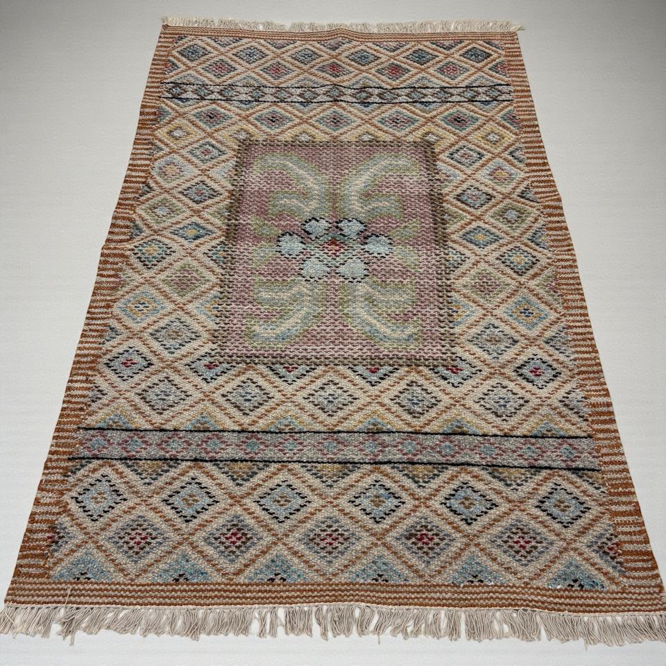 Abstract Wool Kilim Rug-Eco-Friendly Cream & Crimson Symmetrical Flatweave Ivory Field with Traditional Red Motifs