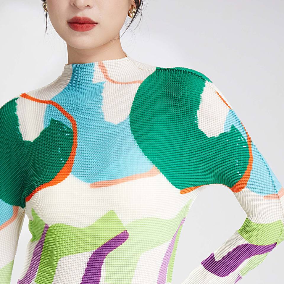 Geometric Print Eco-Friendly Slim Fit Casual Women's Long Sleeve T-Shirts High Quality Elastic Pleated Tops Support