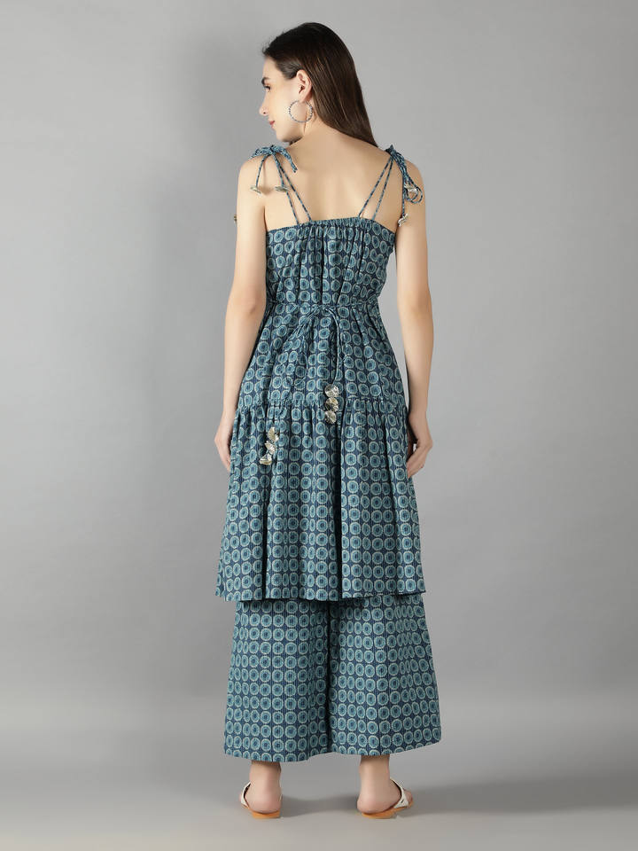 Product Name:Geometric Print Kantha Blue Shoulder And Back Tie Up Kurta Short Pants