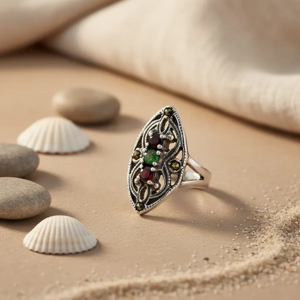 "Geometric Rhodium-Plated 925 Silver Garnet Statement Ring for Women"
